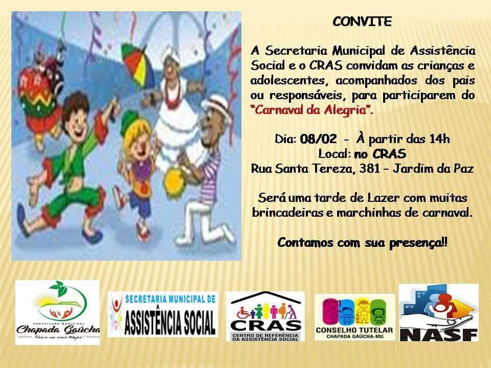 A Secretaria Municipal de Assistência Social e o CRAS, em parceria com o NASF e Conselho Tutelar convidam as crianças e adolescentes para participarem do Bloco da Alegria.