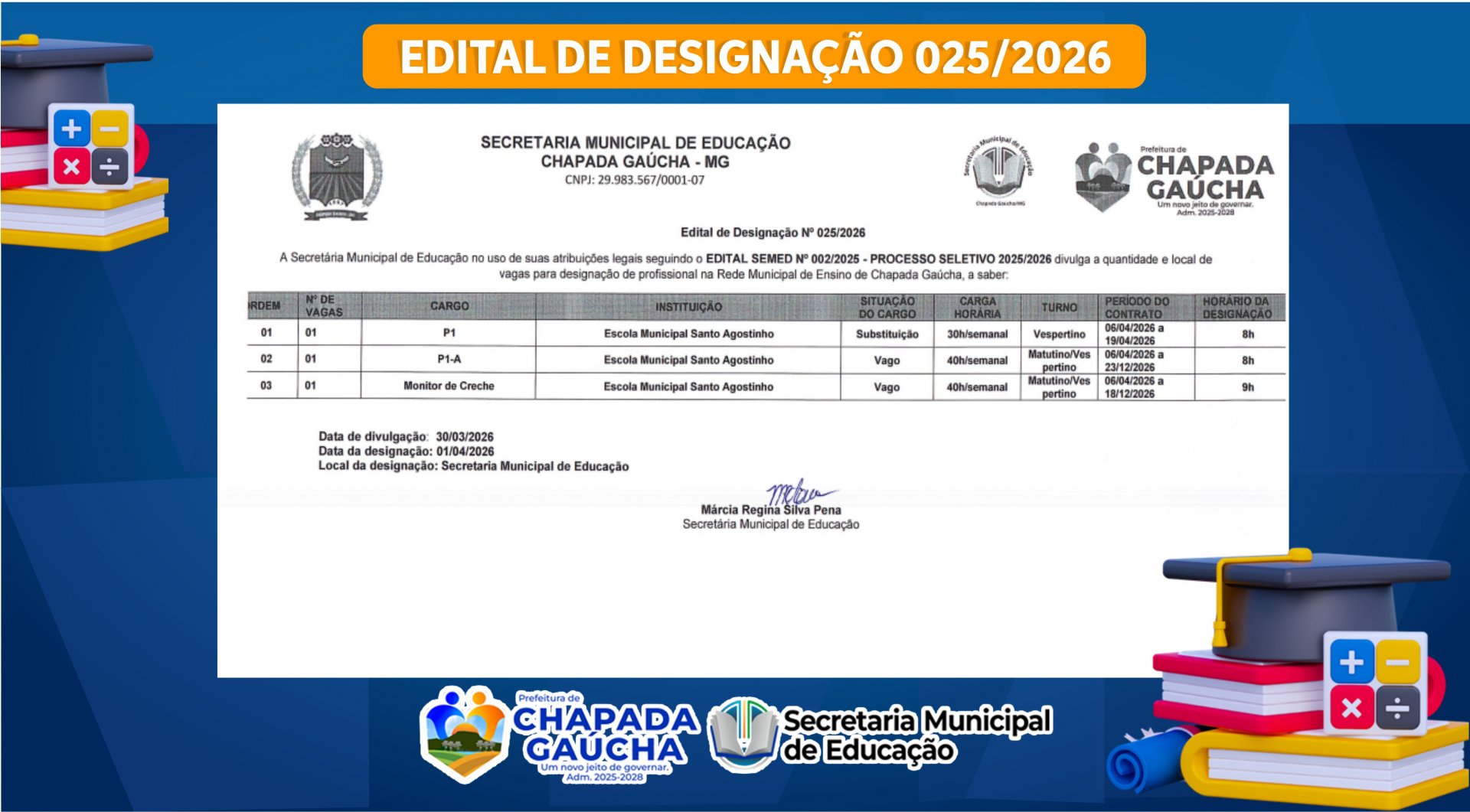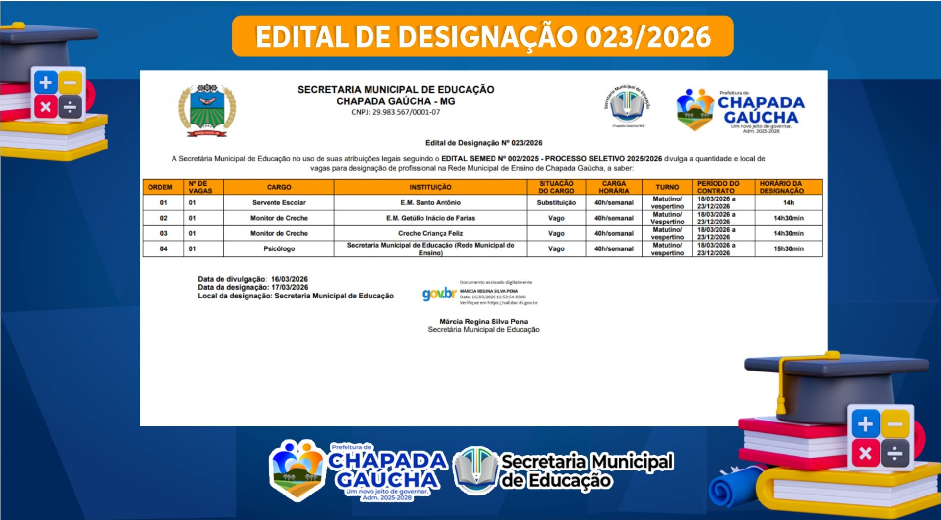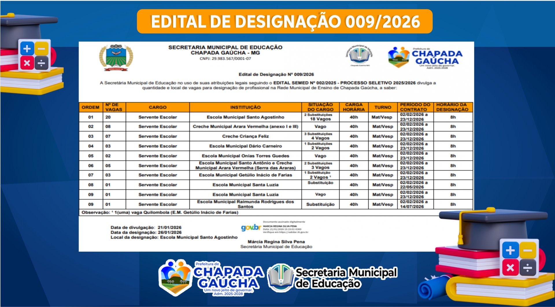 A Secretária Municipal de Educação no uso de suas atribuições legais seguindo o EDITAL SEMED Nº 002/2025 - PROCESSO SELETIVO 2025/2026 divulga a quantidade e local de vagas para designação de profissional na Rede Municipal de Ensino de Chapada Gaúcha, a saber: