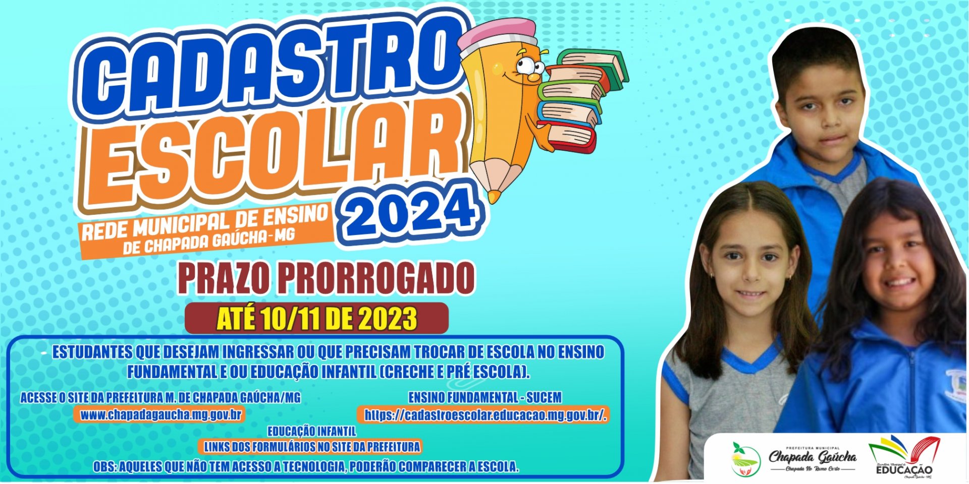 A Secretaria Municipal de Educação de Chapada Gaúcha - MG no uso de suas atribuições legais, divulga formulários eletrônicos para o cadastro escolar da Rede Municipal de Ensino conforme Resolução SEE/MG Nº 4.917/2023. Para efetuar o cadastro, clique no link da faixa escolar de acordo com qual o aluno irá ingressar: