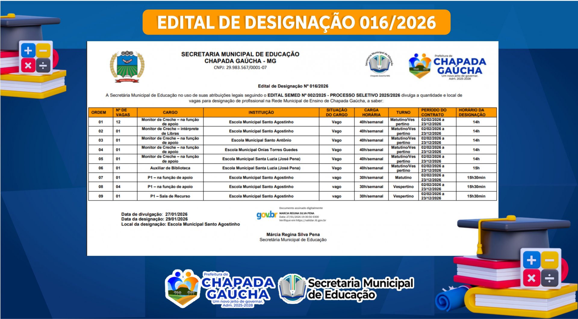 A Secretária Municipal de Educação no uso de suas atribuições legais seguindo o EDITAL SEMED Nº 002/2025 - PROCESSO SELETIVO 2025/2026 divulga a quantidade e local de vagas para designação de profissional na Rede Municipal de Ensino de Chapada Gaúcha, a saber: