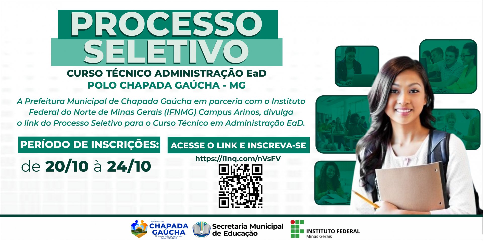 A Prefeitura Municipal de Chapada Gaúcha, em parceria com o Instituto Federal do Norte de Minas Gerais (IFNMG) – Campus Arinos, está com inscrições abertas para o Curso Técnico em Administração – modalidade EaD (Educação a Distância).